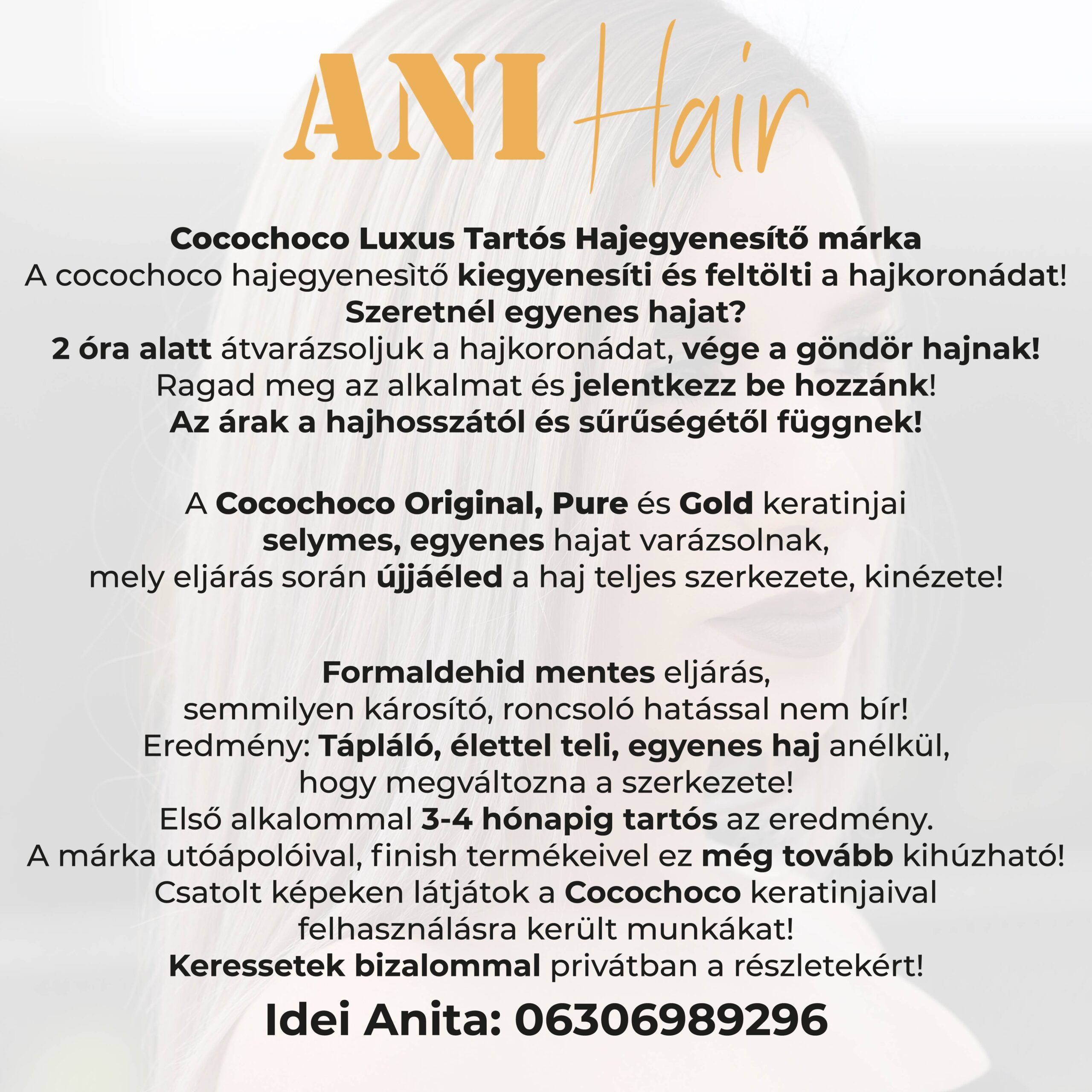 Fotóalbum ANIHAIR FODRÁSZAT Az eredmény magáért beszél Cocochoco egyenesítések Hajhosszabbítások Felrakható lófarok és tresszelt haj Hajfajták Szőkítés, szinezés, 200 gramm, 70 cm-es gyűrűs hajhosszabbítás kúpvassal füszerezve Szőkítés, szinezés, 150 gramm, 60 cm-es nanógyűrűs hajhosszabbítás Melír, gyűrűs varrás, kúpsütés Szőkítés, szinezés, 200 gramm, 60 cm-es hűvelyes hajhosszabbítás vékony kúpvassal besütve Cocochoco tartós egyenesítés