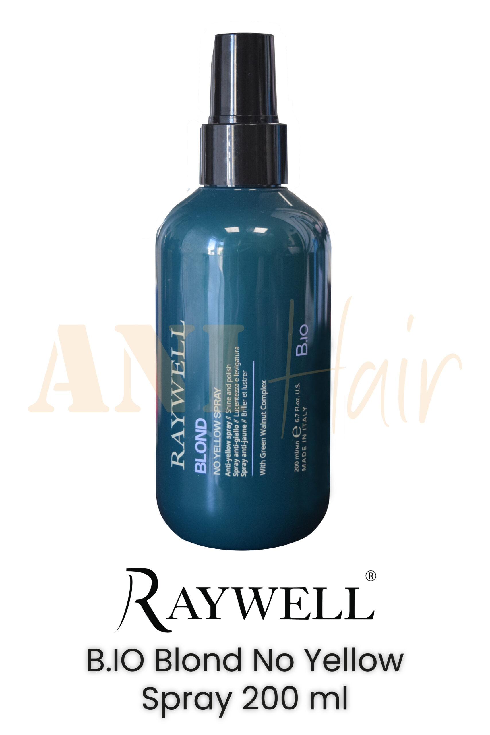 A Raywell B.IO Blond No Yellow Spray egy könnyű, mégis hatékony leave-in hővédő permet, amelyet kifejezetten a szőke, ősz vagy világosított haj hőformázás előtti előkészítésére fejlesztettek. A formula violet-blue pigmentekettartalmaz, amelyek láthatóan semlegesítik a nem kívánt sárga és arany tónusokat, miközben a GREEN WALNUT Complex antioxidáns pajzsként védi a hajat a hő és a környezeti ártalmak ellen.